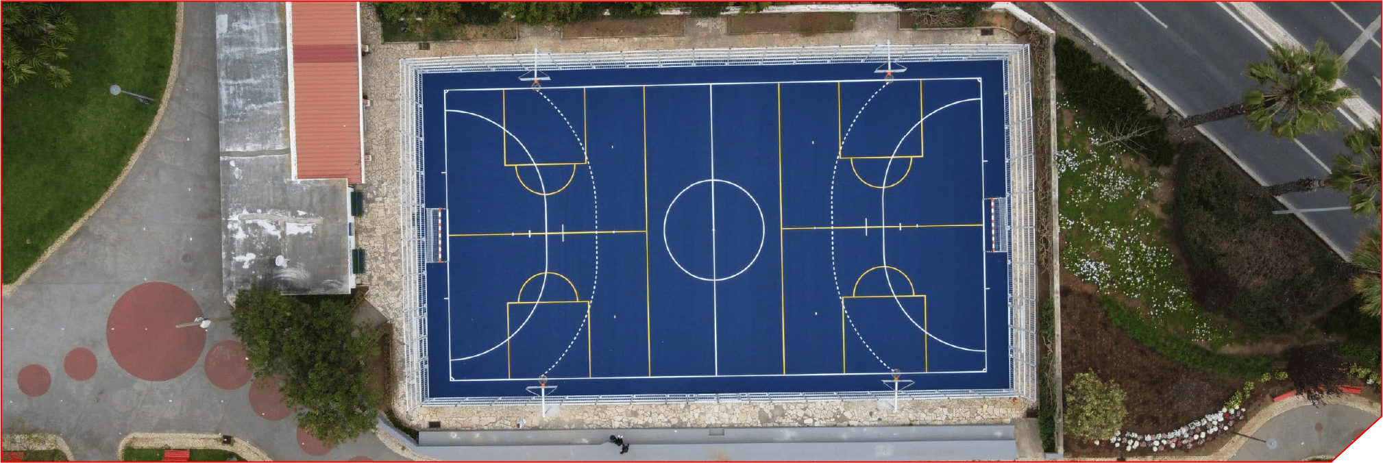 Anti-vandal aluminium multisport arena with anti-corrosion treatment and Patmos Evolution flooring, designed for maximum performance, efficient drainage, and comfort in every movement.