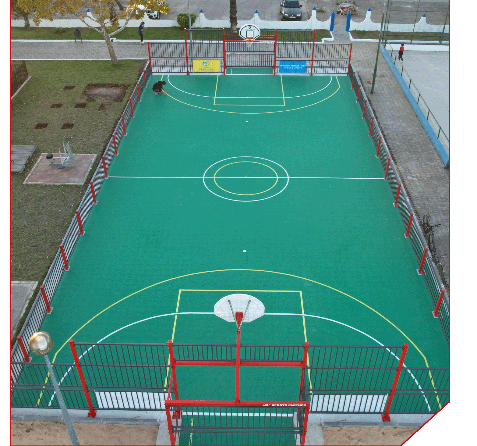 Anti-vandal metal structure with anti-corrosion treatment and Patmos Master modular flooring, offering excellent shock absorption, stability, and grip. A robust and safe solution for any sports activity.