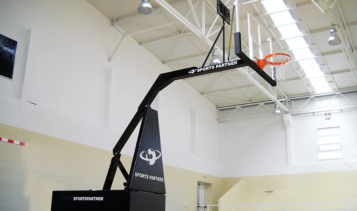 Carro de Basquetebol Oficial “Competition” com tabela em vidro acrílico, aro basculante, proteções da tabela e sistema de elevação Hidráulico. Construído de acordo com a norma EN1270